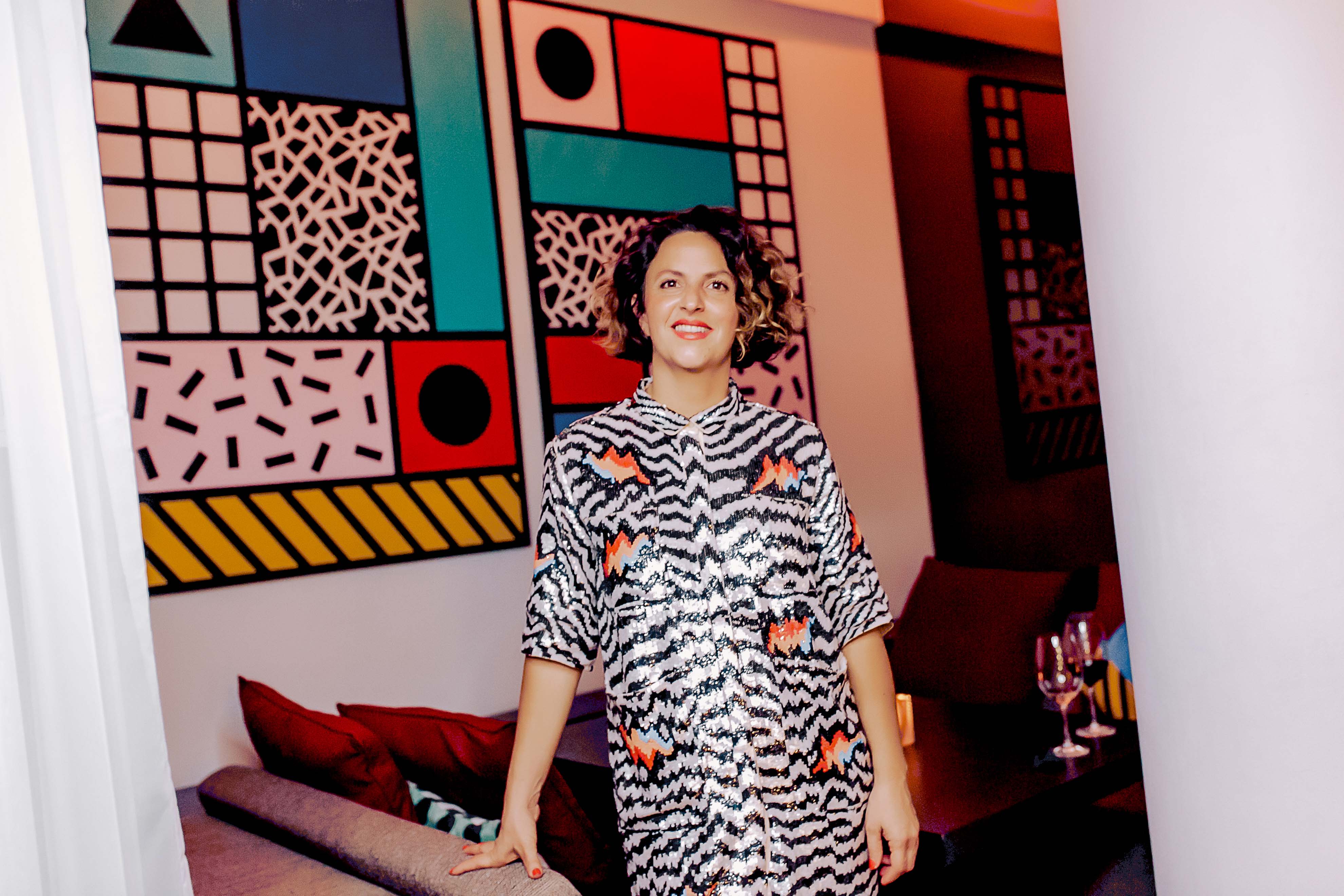 Influences include the Memphis Movement, the Ndebele tribe and Optical Art master Vasarely alongside the simple desire to put a smile on people’s faces. Her signature Tribal POP style present a boundless energy that work perfectly for show-stopping and social spaces – “the bigger the better”.