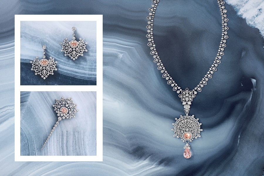 [ngg_images source=”galleries” container_ids=”70″ display_type=”photocrati-nextgen_basic_slideshow” gallery_width=”700″ gallery_height=”394″ cycle_effect=”fade” cycle_interval=”3″ show_thumbnail_link=”0″ thumbnail_link_text=”[Show thumbnails]” slug=”promenades-imperiales” order_by=”sortorder” order_direction=”ASC” returns=”included” maximum_entity_count=”500″]Lace-like diamond motifs, evoking snowflakes or Russian decorative patterns, are lit up by the limpid blue of Ceylon sapphires, echoing the pure sharp azure of the day, or by the orangey pink of the Padparadscha sapphires recalling dawn or dusk.
