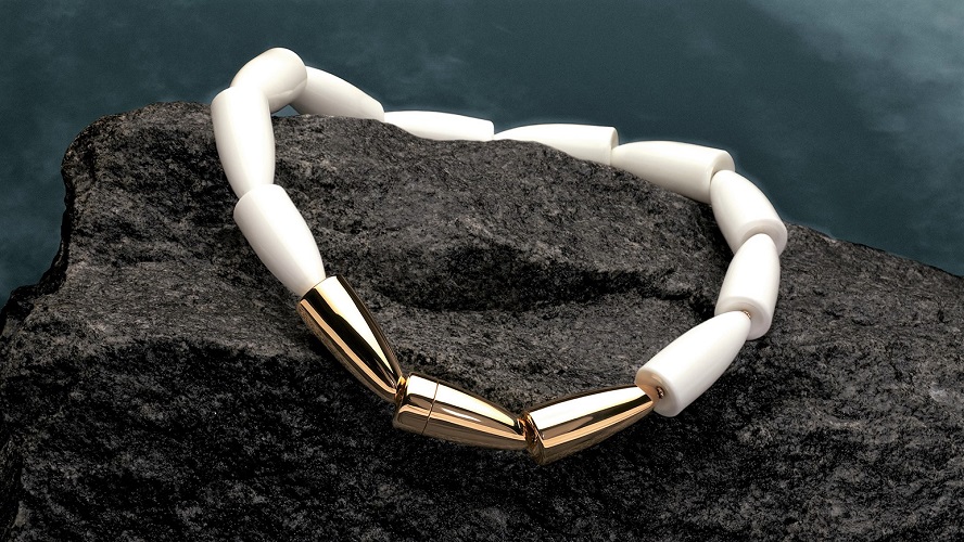 The dual tone Calla necklace is a case study in streamlined glamour, with perfectly polished conical beads flowing seamlessly into each other’s slipstream.The creation relies on gold and volcanic Cacholong (Kogolong) to express its minimal yet eye-catching aesthetic.