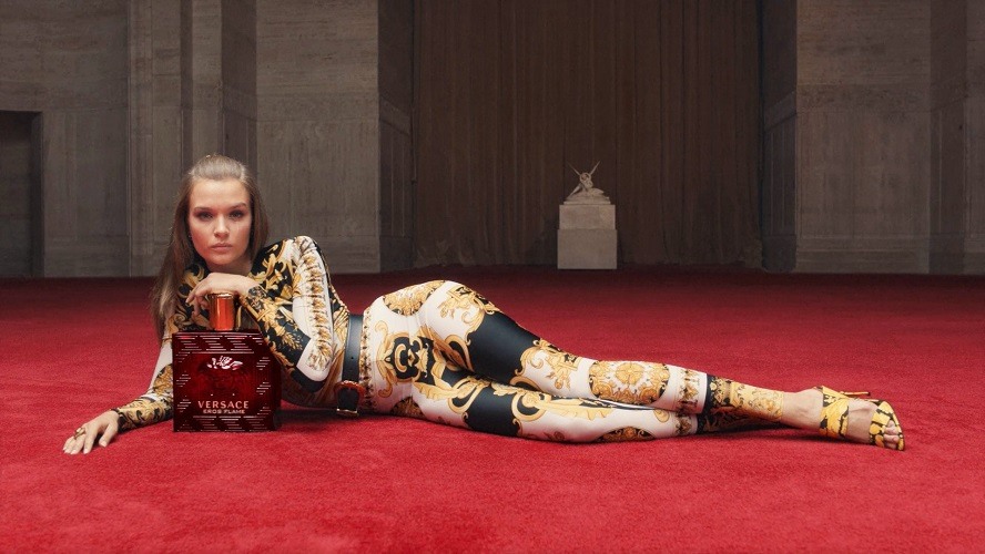The new image of Versace Eros Flame proposes the sudden love between a man and a woman, played by the beautiful Gigi Hadid, both in a Versace throw.