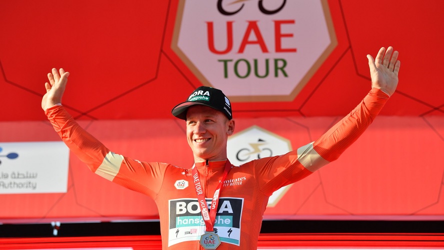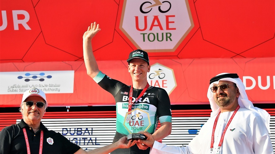German sprinter Pascal Ackermann has won the 2020 UAE Tour Stage 1, the Dubai Silicon Oasis Stage (DSO 148 km), in its second edition, ahead of Caleb Ewan and Rudy Barbier. Pascal Ackermann is the leader of the General Classification and was awarded the Red Jersey and the Green Jersey.